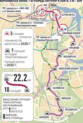 Напомним, Бирюлевская линия - седьмая новая ветка, которая строится в Москве за последние годы буквально с нуля. Длиной 22 километра, на схеме Московского метрополитена она будет обозначена рубиновым цветом. Разместятся вдоль нее 10 станций: "ЗИЛ", "Остров мечты", "Кленовый бульвар", "Курьяново", "Москворечье", "Кавказский бульвар", "Каспийская", "Липецкая", "Лебедянская" и "Бирюлево". В перспективе линия может дойти до Щербинки. Как Собянин подтвердил планы правительства Москвы, первая очередь - от станции "ЗИЛ" до "Курьяново" (четыре станции, 8,65 км участок), должна быть построена до 2028 года, работы в настоящее время ведутся уже на всех станциях. Окончание всего строительства - это еще 13,55 километра путей на участке "Курьяново" - Бирюлево" - запланировано до 2029 года.