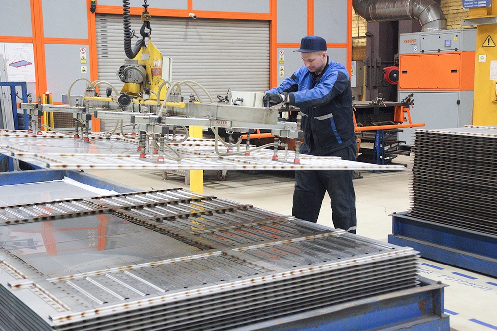 Рядом роботизированные аппараты сгибают сталь и придают ей нужную форму. Один пресс оборудован роботизированной рукой, она внедрена для изготовления деталей более 100 кг веса.