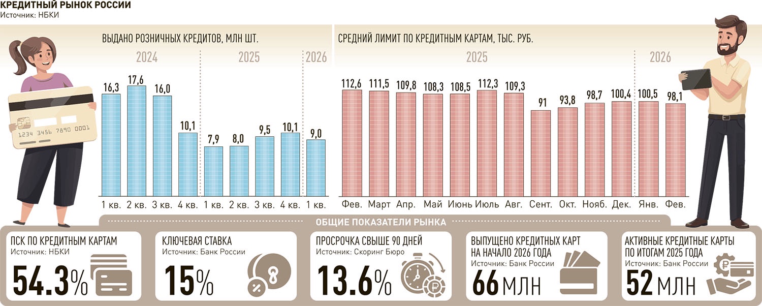 Средние лимиты по выданным кредитным картам снизились до уровня 90-100 тыс. руб. во втором полугодии 2025 и начале 2026 года, рассказали "Российской газете" в Национальном бюро кредитных историй (НБКИ). Это обусловлено, как объясняют эксперты, низким аппетитом к риску со стороны банков.