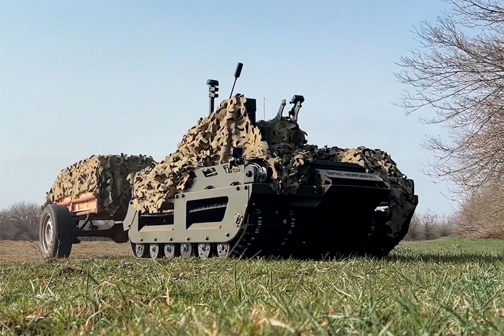 При этом безэкипажное гусеничное транспортное средство не боится пересеченной местности и, судя по обнародованному видео, достаточно быстро передвигается.