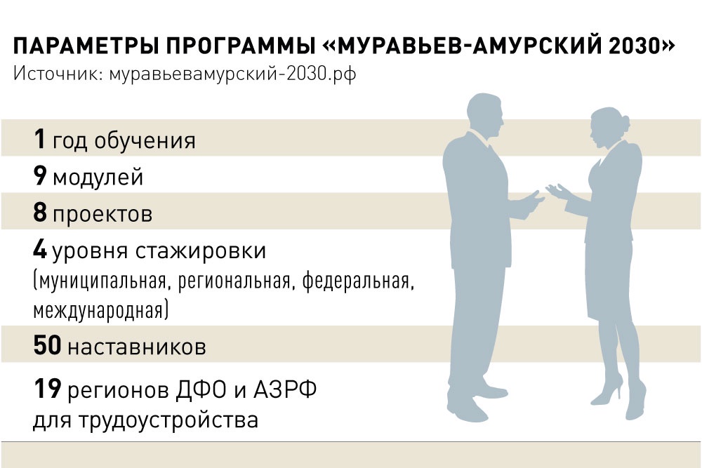 Стать участником "Муравьев-Амурский 2030" может гражданин РФ в возрасте от 21 до 35 лет, имеющий высшее образование (магистратура или специалитет) и как минимум два года практического стажа на госслужбе или по профилю подготовки. Программа представляет собой годовой трек из девяти модулей, проходящих в регионах ДФО и Арктики, Москве и КНР.