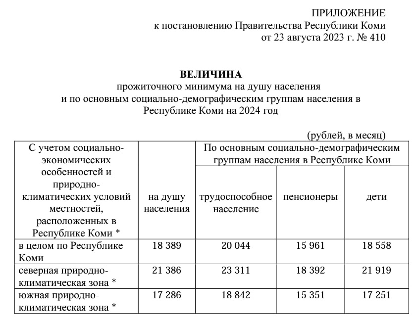 *Природно-климатические зоны определены в соответствии со статьей 4 Закона Республики Коми "О прожиточном минимуме в Республике Коми".