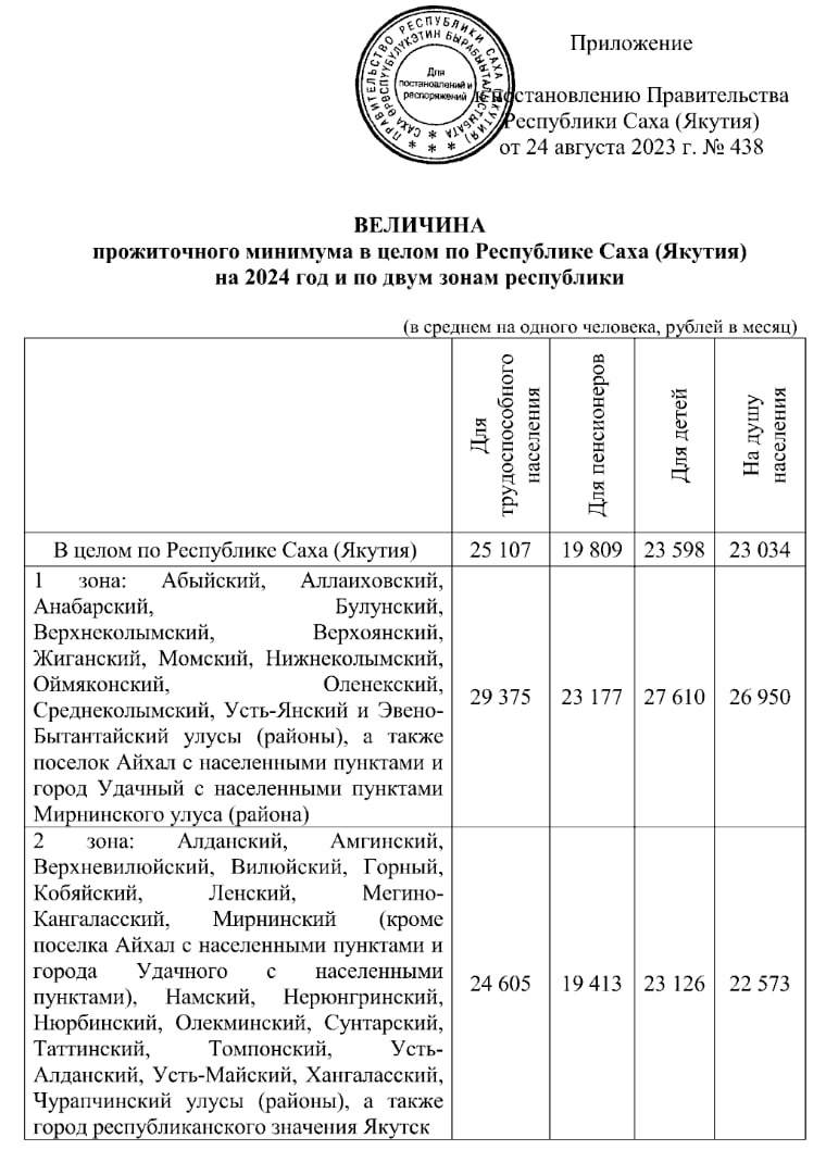 1. Установить величину прожиточного минимума в целом по Республике Саха (Якутия) на 2024 год: на душу населения - 23 034 рубля, для трудоспособного населения - 25 107 рублей, для пенсионеров - 19 809 рублей, для детей - 23 598 рублей и величину прожиточного минимума по двум зонам республики согласно приложению к настоящему постановлению.