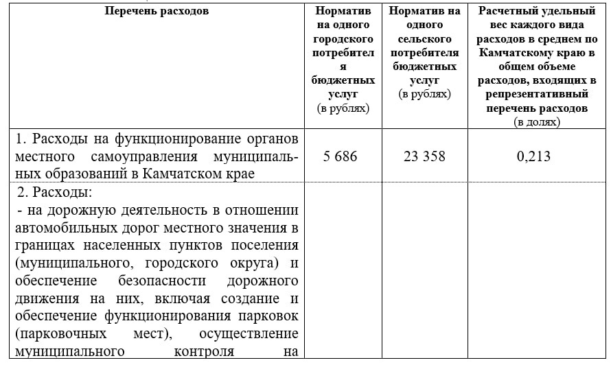 2. Установить значения нормативов расходных обязательств в расчете на одного потребителя и значения расчетного удельного веса каждого вида расходов, входящих в репрезентативный перечень расходов, в размерах согласно таблице: