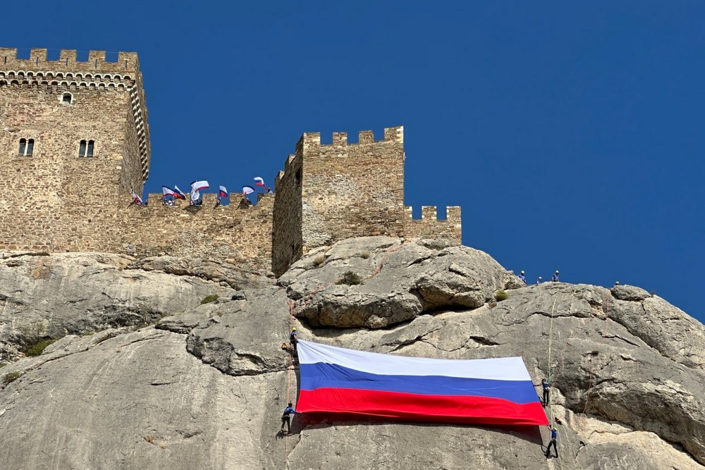 В Крыму спасатели развернули флаг России на обрыве у стен Генуэзской крепости