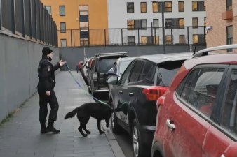 Кинолог с собакой обследует место ЧП на парковке в Москве
